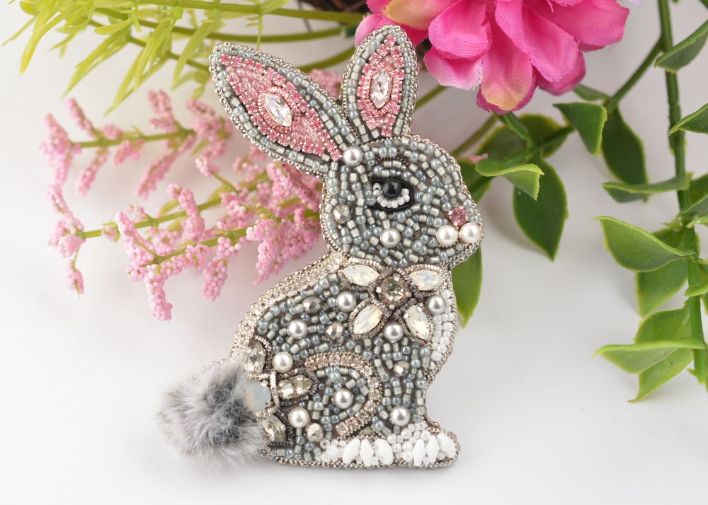 This elegant grey bunny features white accents, sweet pink crystal-lined ears, and the most adorable fluffy tail made from fur yarn. Every element is designed to teach you rich bead embroidery techniques while creating a piece full of springtime personality.